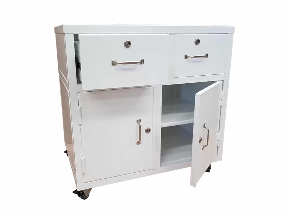 Includes lockable sliding drawers and hinged doors with shelved storage space.